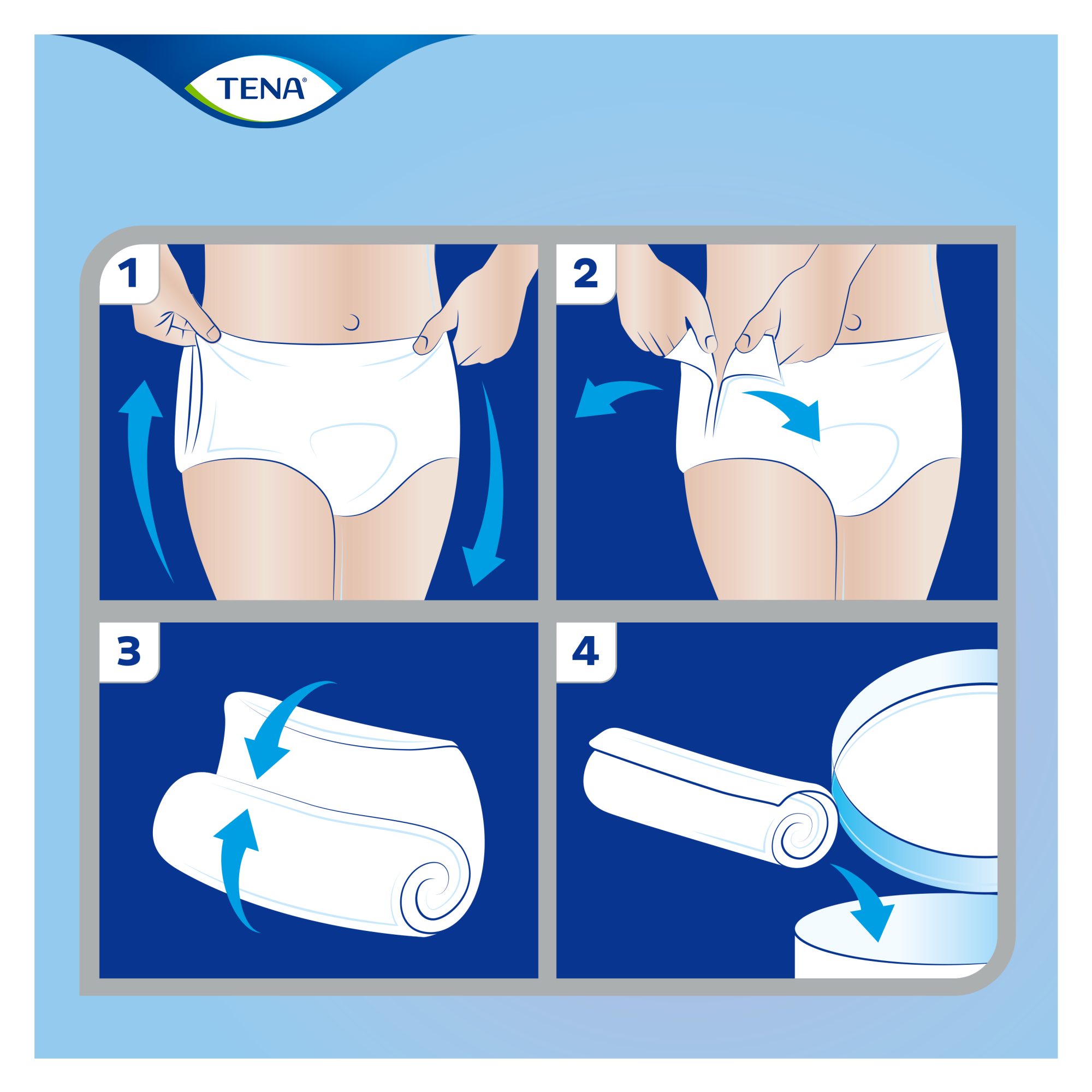 TENA Pants Discreet er myke og komfortable buksebleier med høy midje, utformet for middels urinlekkasje. Denne beskyttende buksebleien med høy yteevne for urinlekkasje har fuktreduserende teknologi for å sikre tørrhet, lekkasjesikkerhet og luktkontroll. Den har stretch for å tilpasse seg kroppens form, noe som gjør den svært sikker og diskré selv under trange klær. Disse engangs buksebleiene for urinlekkasje er laget av tekstillignende, pustende materialer med en enestående absorberingsevne, og minner om vanlig undertøy. Produktet tilrettelegger for en uavhengig og aktiv hverdag.
